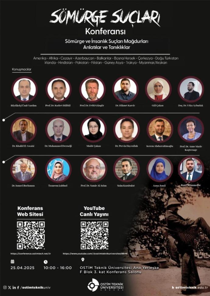 Sömürge Suçları Konferansı, OSTİM Teknik Üniversitesi’nin resmi YouTube kanalı üzerinden canlı olarak yayınlanacaktır. Katılımcılar, oturumları çevrimiçi olarak takip edebilecek olup konuşmacılara sorular yöneltebilecek ve canlı sohbet üzerinden diğer katılımcılarla tartışmalara katılabileceklerdir.